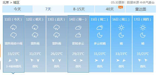 北京天气:今天阴转中雨天气闷热 周末降温多雷雨
